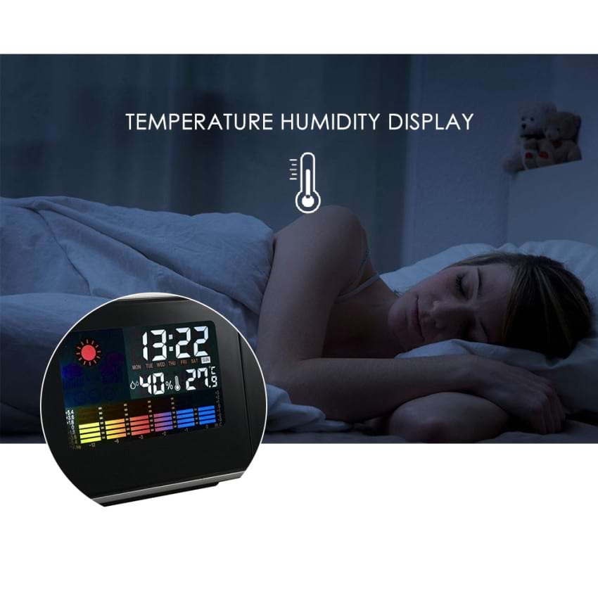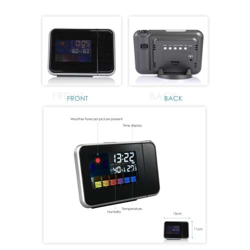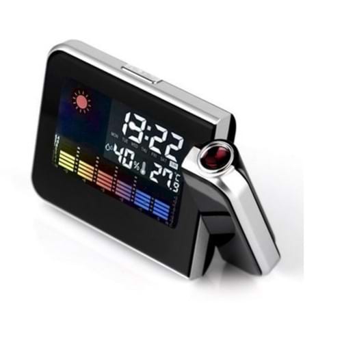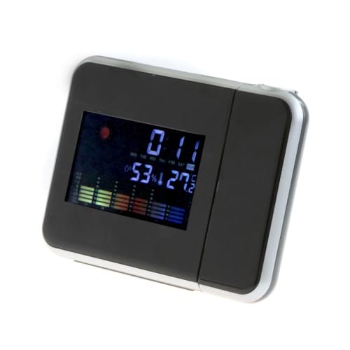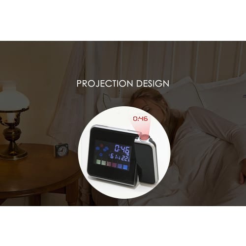 Alarmklocka med projektor och tydlig LCD-skärm som visar tid, temperatur, luftfuktighet och väder. Ord. pris 699 kr, ditt pris 199 kr