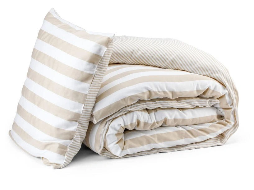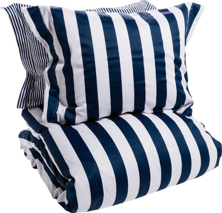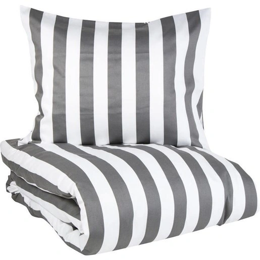Ena sidan har smala lodräta linjer och den andra sidan har breda ränder, vilket gör att du enkelt kan variera känslan i bäddningen. Bäddsetet är tillverkat i 100% bomullsatin och har en mjuk känsla mot huden. Materialet låter också kroppen andas under natten, vilket bidrar till en behaglig sovmiljö.
