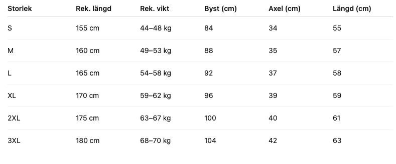 Tröjan är i CN-storlekar, vi rekommenderar att du väljer 1–2 storlekar större än du vanligtvis bär.