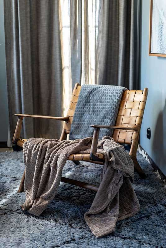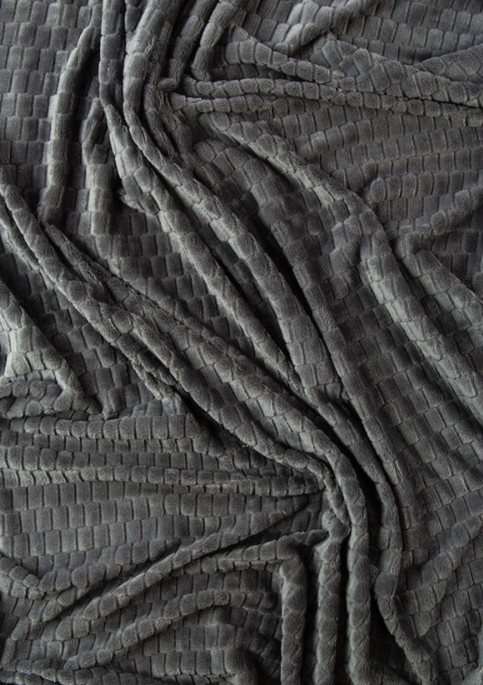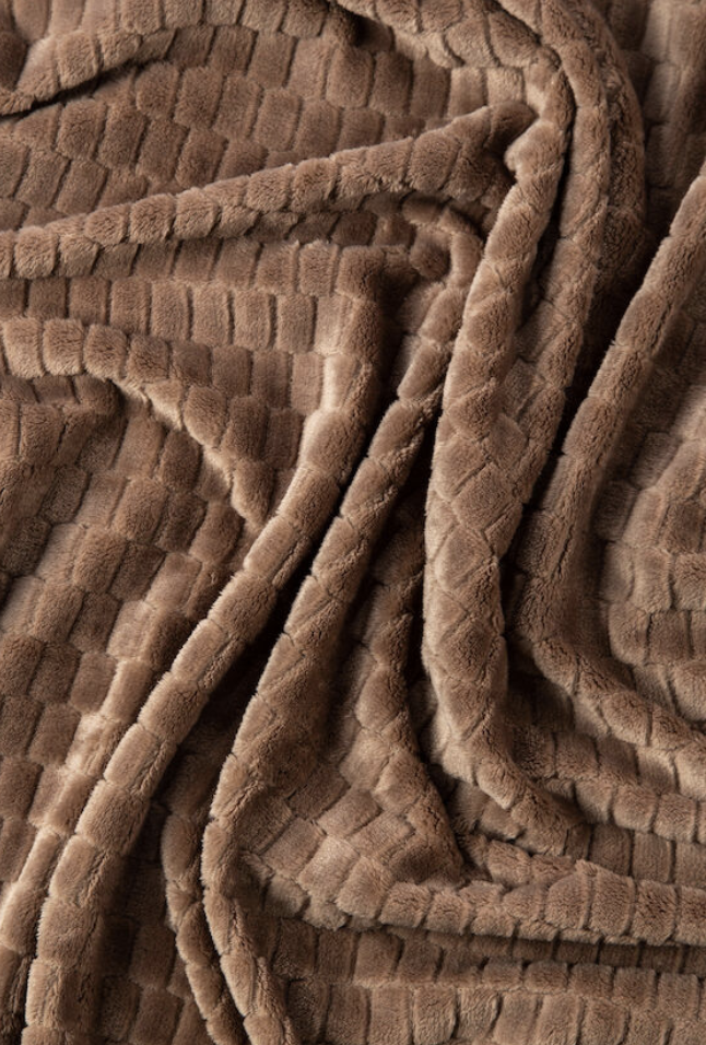 Plädens framsida har ett mönster av små rektanglar medan baksidan är slät. Pläden är lika mjuk och mysig som den är dekorativ och passar både att svepa om sig som att förhöja inredningen.