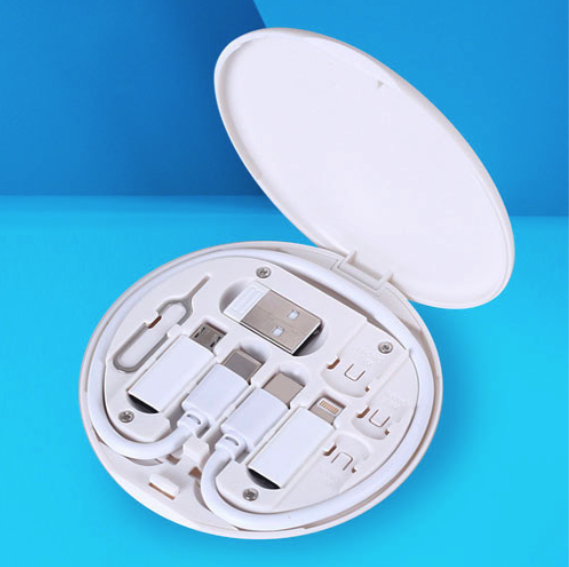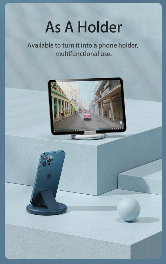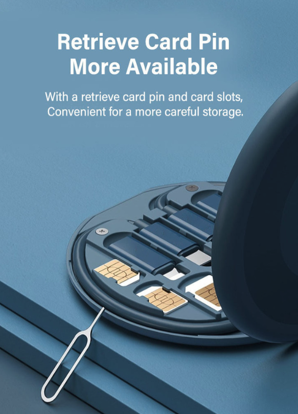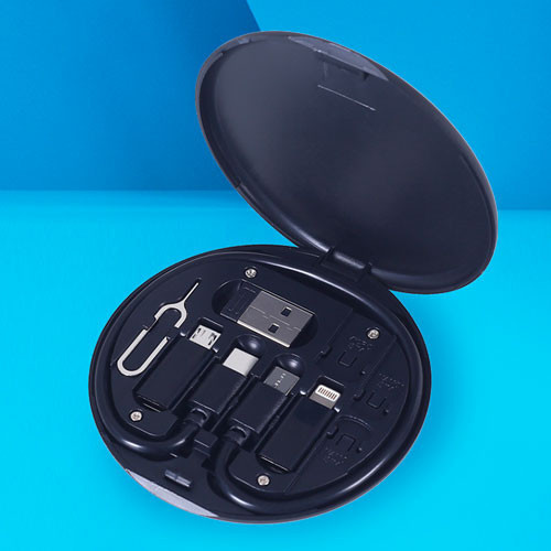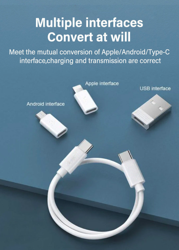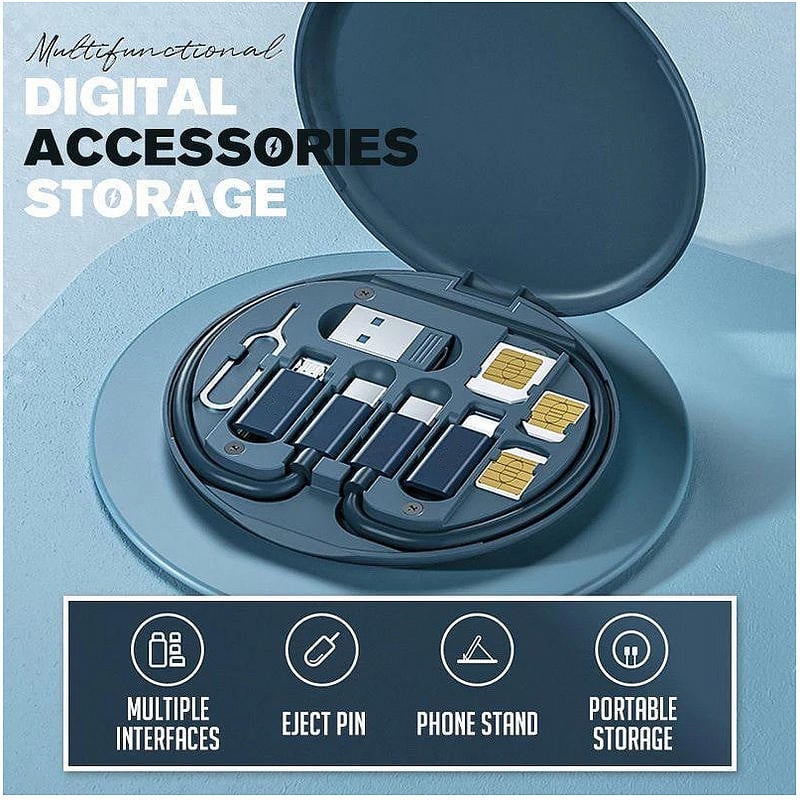 Förvaringsfodralet har fyra olika portar för konvertering, laddning, överföring och mer. Innehåller en USB C-kabel med 3 adaptrar har allt du behöver för att ladda och överföra data för Android/IOS-enheter. Fodralet kan även användas som telefonställ.