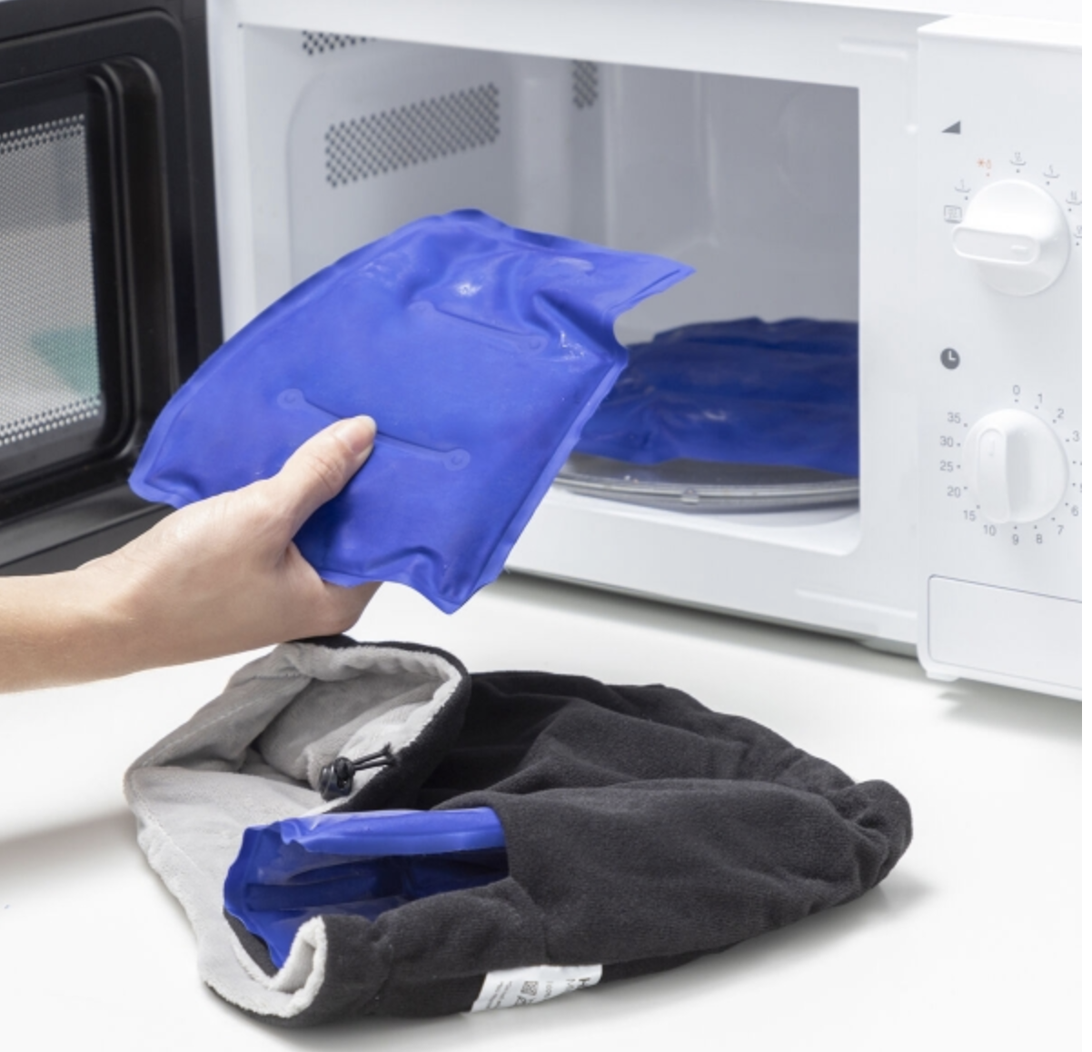- Den innehåller 4 avtagbara gelpåsar som kan värmas upp i mikrovågsugnen för värmande effekt eller placeras i kylen/frysen för kylande effekt.