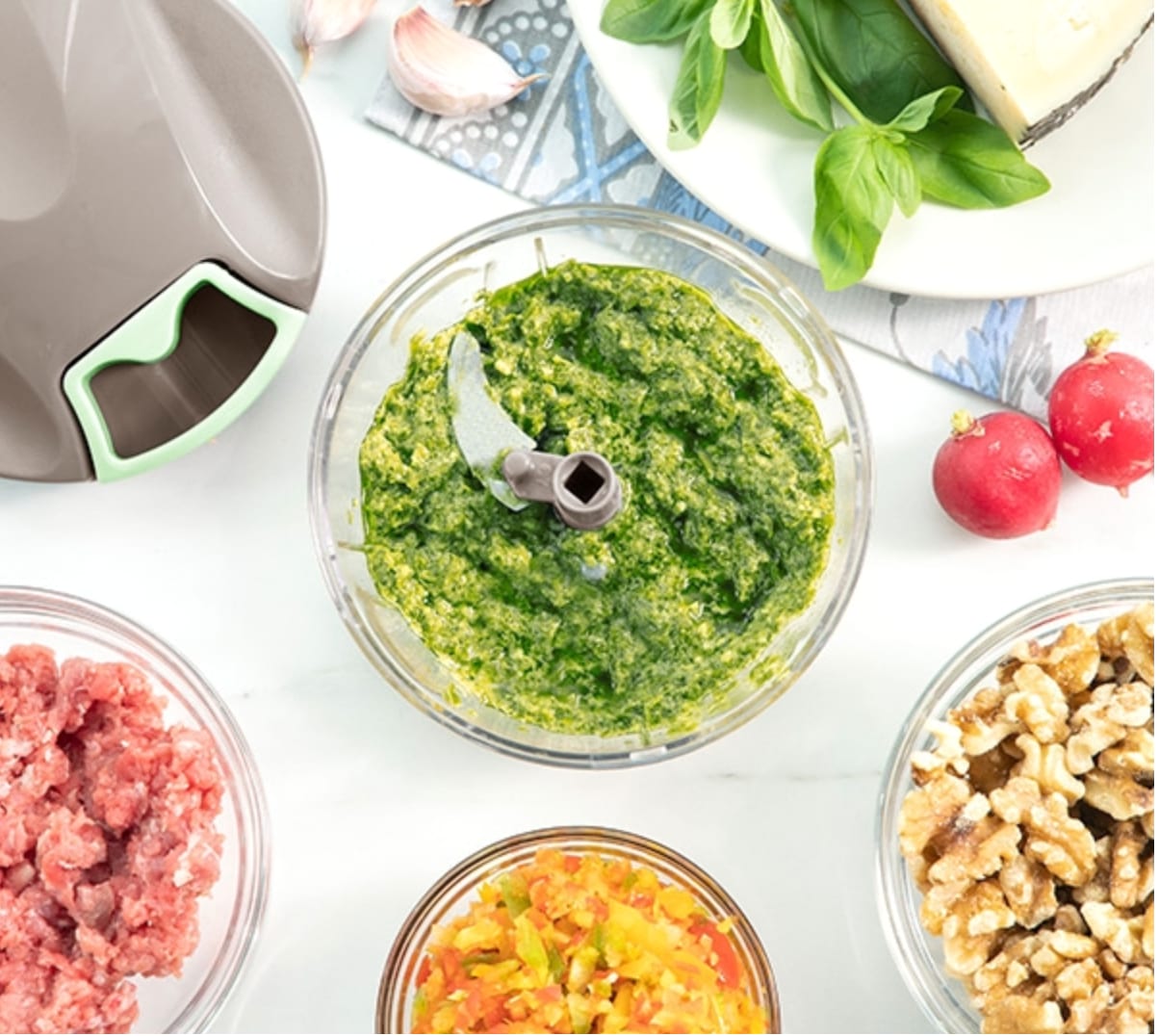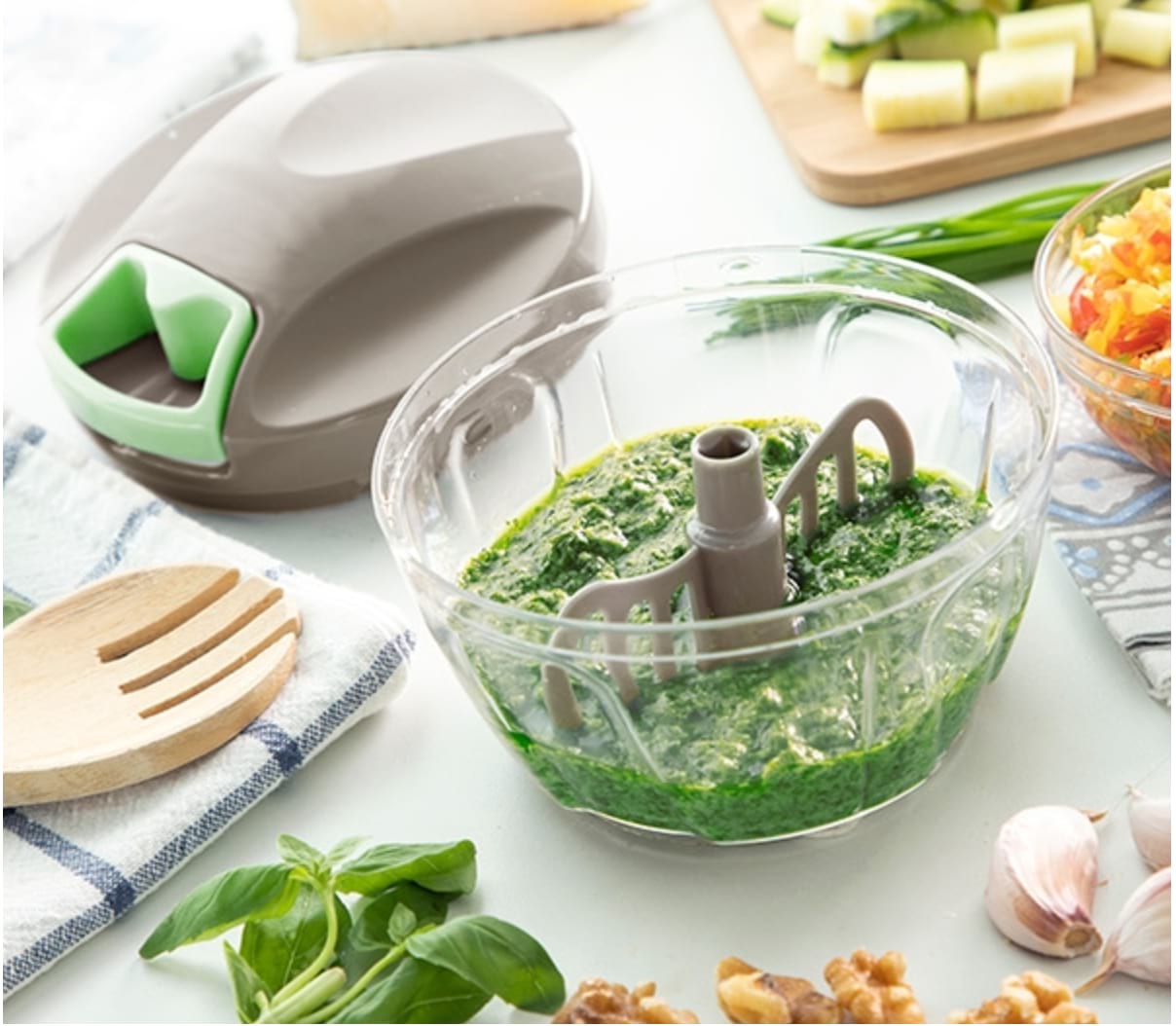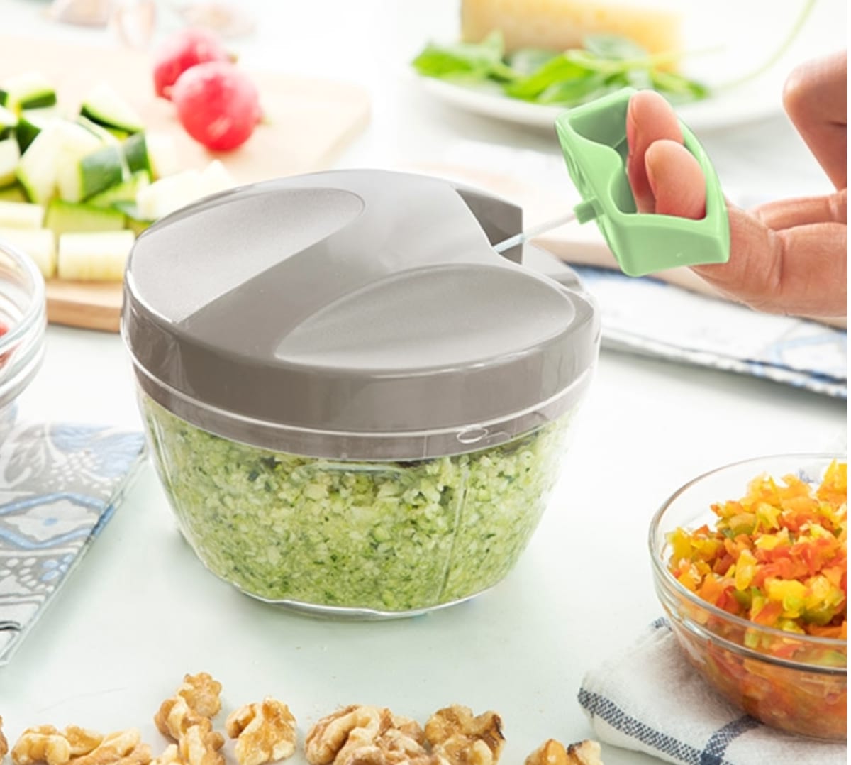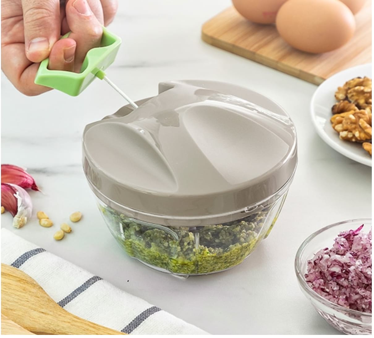 Den är enkel att använda och hackar mat med hjälp av en simpel manuell sladdmekanism. Du håller helt enkelt hackaren i ena handen, medan du med den andra handen drar i sladden på locket ett antal gånger för att uppnå önskad hacknivå: resultatet (större eller mindre bitar) beror på hur många gånger du drar sladden.