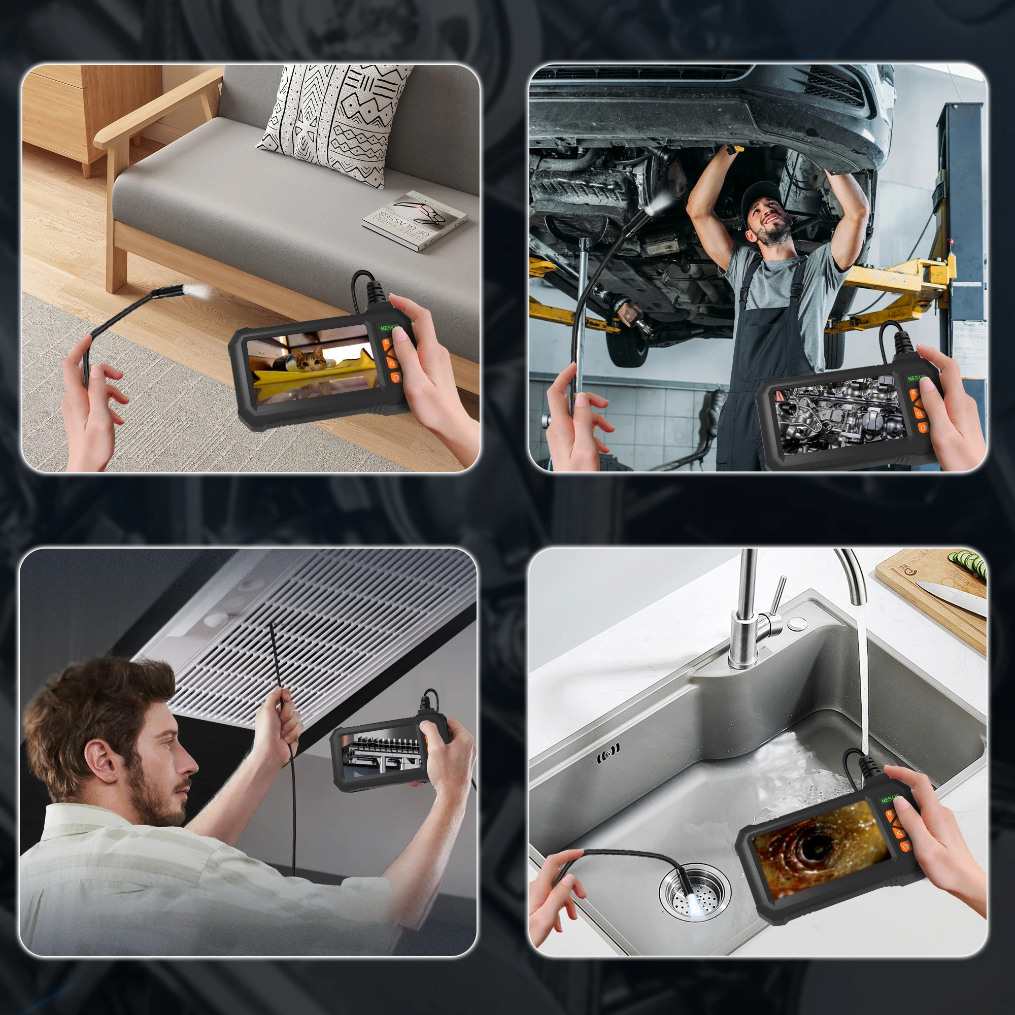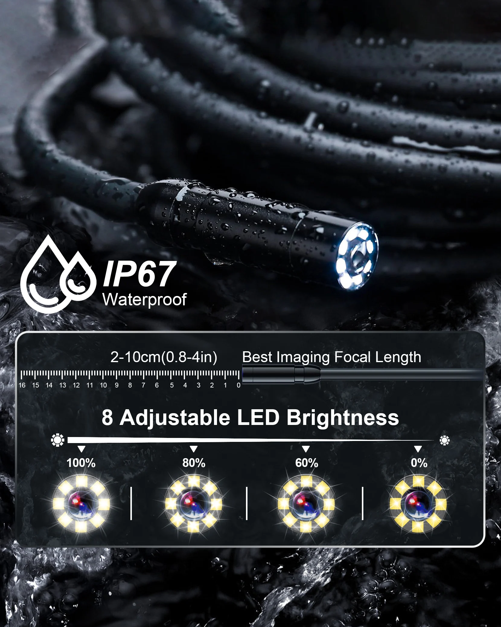 Den flexibla kabeln och den lilla kameran gör det enkelt att undersöka svåråtkomliga utrymmen. Den inbyggda LED-belysningen och justerbara ljusstyrkan gör att du ser klart även i mörka utrymmen. Kameran är dessutom vattentät (IP67) och utrustad med ett uppladdningsbart batteri som ger upp till 3,5 timmars användning.