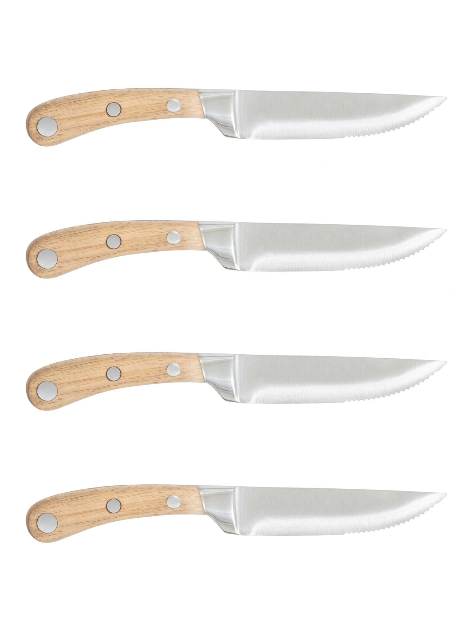 De vassa bladen i rostfritt stål gör det enkelt att skära genom både mört och saftigt kött, och de vackra handtagen i gummiträ ger ett elegant och naturligt uttryck på bordet.