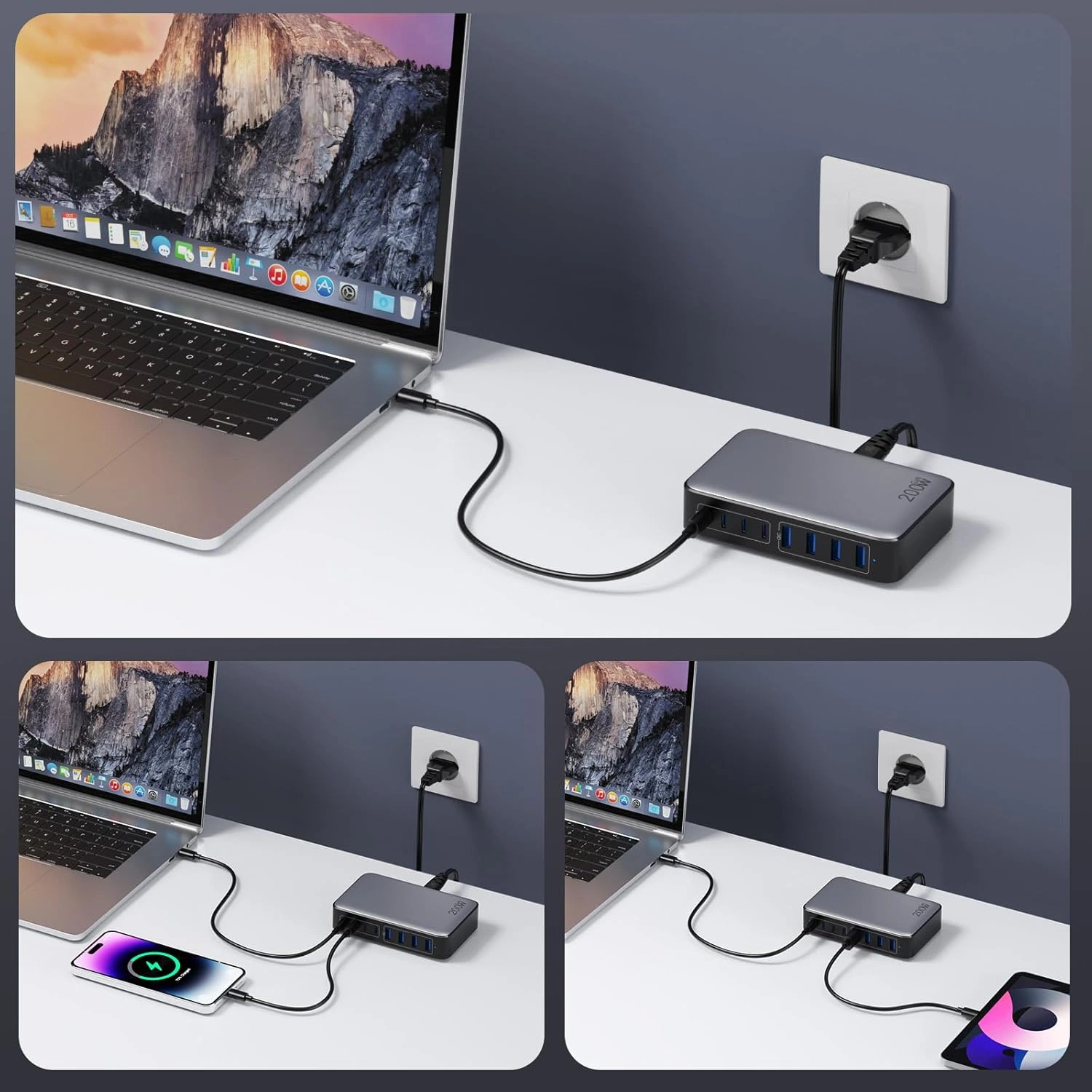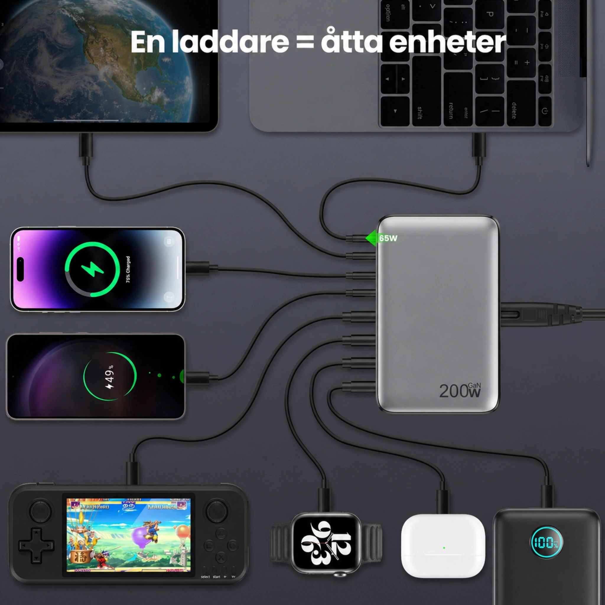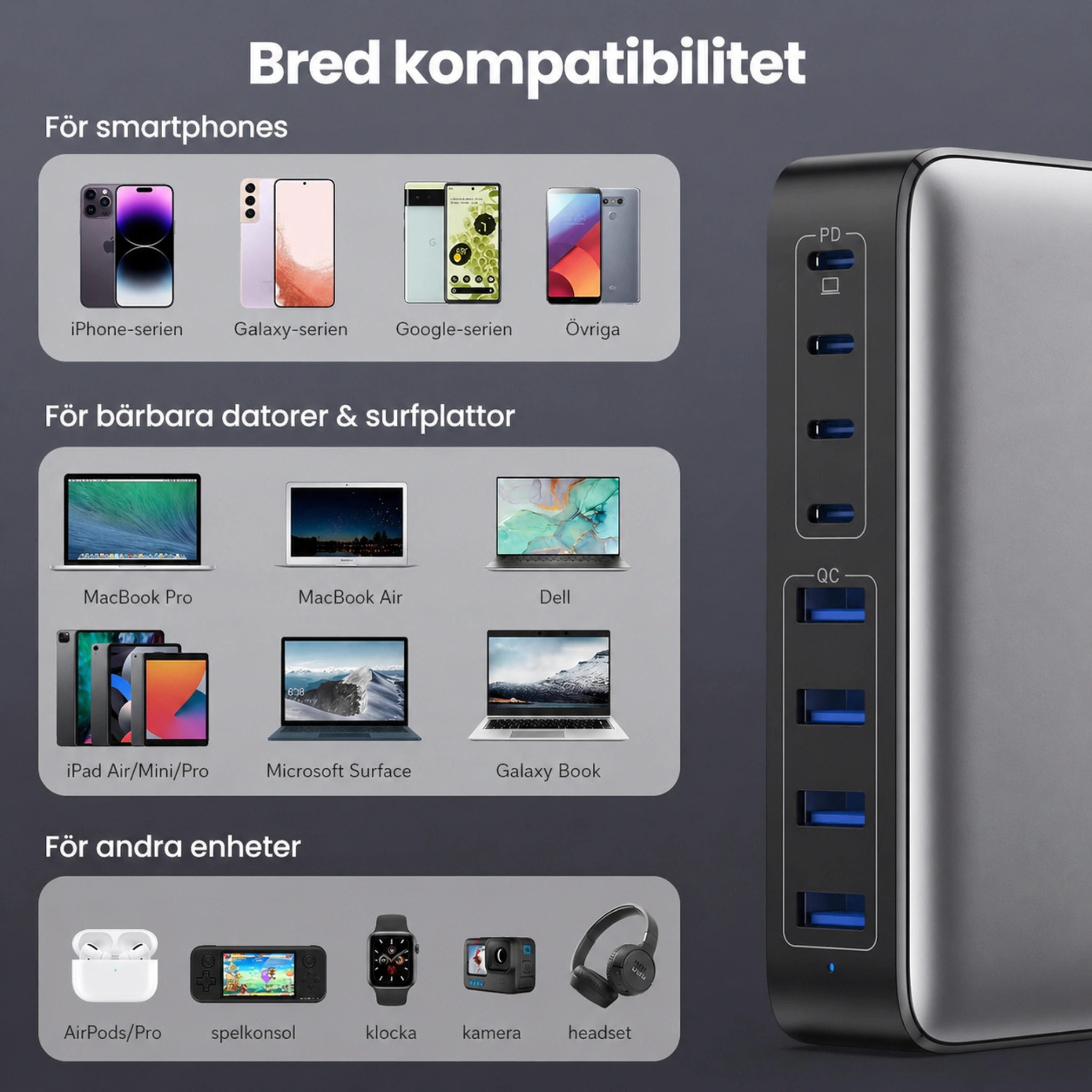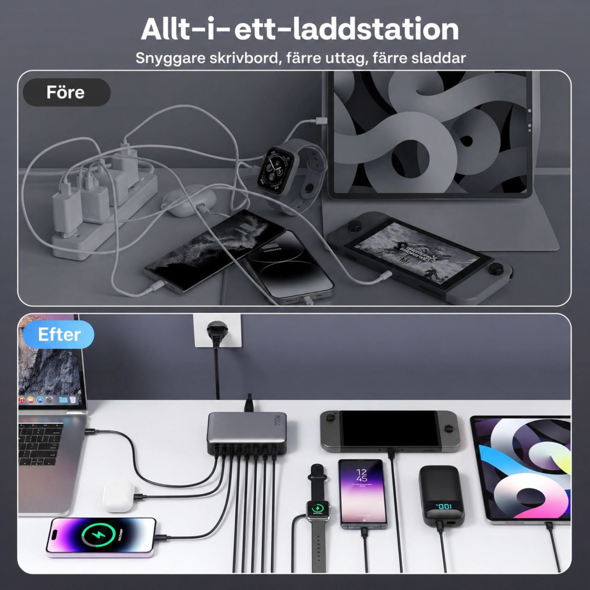 Slipp flera olika laddare. Med denna smarta 8-i-1 laddstation kan du ladda mobil, surfplatta, hörlurar, laptop och andra enheter samtidigt - snabbt, säkert och smidigt.
