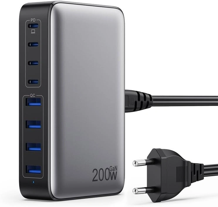 - 8 portar i en laddare, 4 USB-A och 4 USB-C