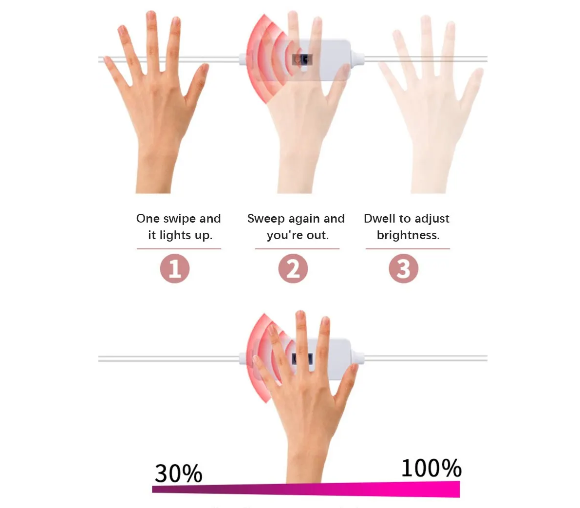 Utrustad med en handsvepssensor med 2–5 cm räckvidd tänder och släcker LED-listen utan att du behöver röra den. De högkvalitativa SMD-LED-chipen ger ett klart och jämnt ljus med lång livslängd, och du kan enkelt justera ljusstyrkan för att skapa rätt stämning eller funktionell arbetsbelysning.