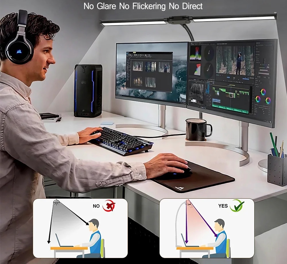 - Justerbar vidvinkelbelysning – perfekt för L-formade skrivbord eller arbetsstationer med flera skärmar