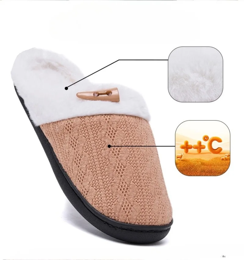 Dessa mjukt stickade tofflor omfamnar dina fötter med ett supermjukt, varmt och fluffigt foder som gör varje steg till ren komfort. Perfekta för kyliga morgnar, mysiga kvällar eller när du bara vill unna dig lite extra välbefinnande hemma.