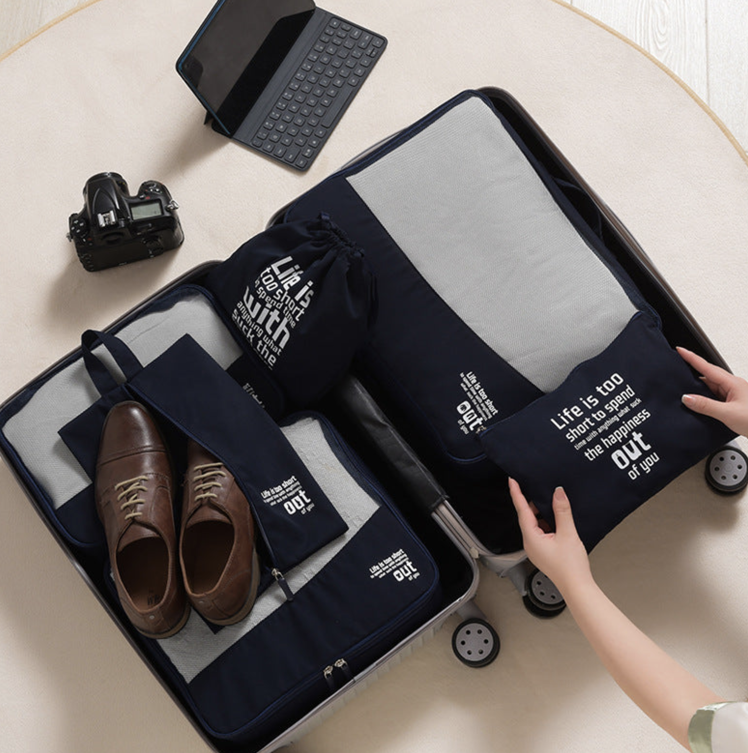 Dagens deal är ett komplett organiseringsset till din resa. Njut av din semester och låt detta set ta hand om organiseringen åt dig. Förenkla packningen med detta set av väskor och påsar som låter dig effektivt organisera och hålla dina kläder och accessoarer prydligt separerade i resväskorna efter storlek. Använd vad du behöver i setet för olika resor!