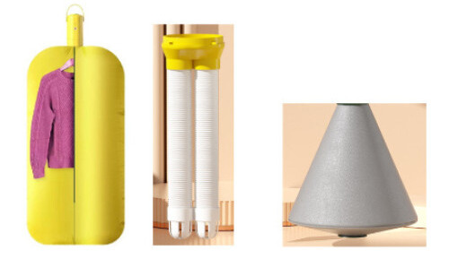 Den smarta konstruktionen kan fällas ihop när den inte används och sparar då upp till 80 procent utrymme. När den öppnas fälls de två luftslangarna ut och fördelar värmen jämnt för effektiv torkning.