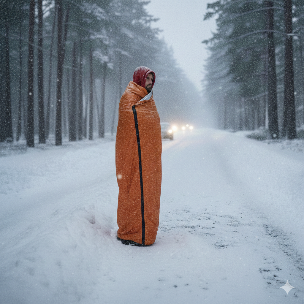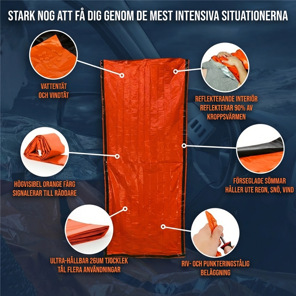 Kombinationen av tåligt PE-material och reflekterande aluminium skapar en barriär som återkastar upp till 90 % av din kroppsvärme. Det är ett effektivt skydd mot hypotermi (nedkylning) och köldskador. Vid snöoväder eller kraftigt regn håller sovsäcken dig torr och skyddar mot vind. Till skillnad från en vanlig filt omsluter den hela kroppen, minskar luftcirkulationen och bevarar värmen effektivt.