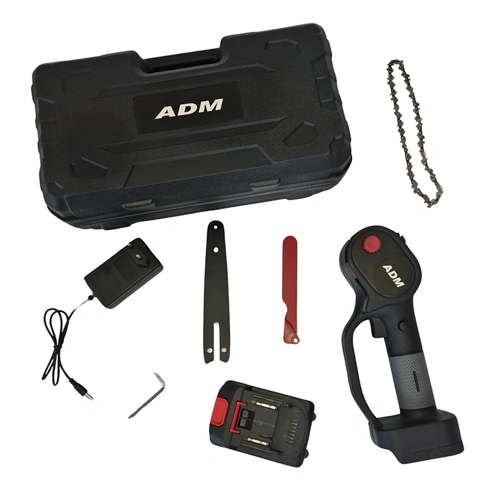 - Innehåll: handmotorsåg, guideplåt, härdad kedja, skyddsbaffel, batteri, laddare, insexnyckel, förvaringsväska, användarmanual (engelska)