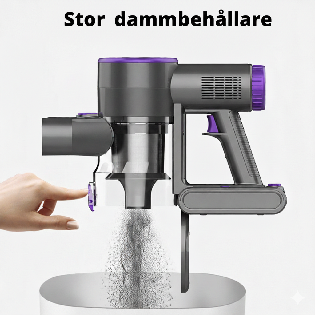 Med en vikt som gör den lättmanövrerad och ett batteri som räcker i upp till 30 minuter, hinner du städa hela hemmet utan avbrott. När du är klar tömmer du den rymliga behållaren med ett enkelt klick, hygieniskt, snabbt och utan krångel.
