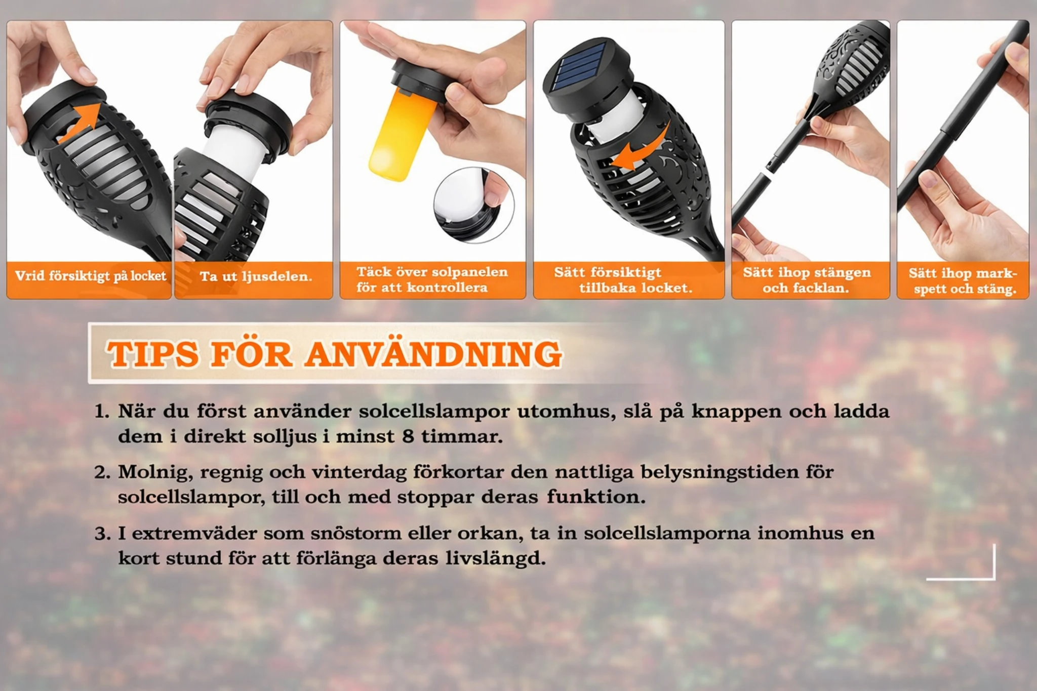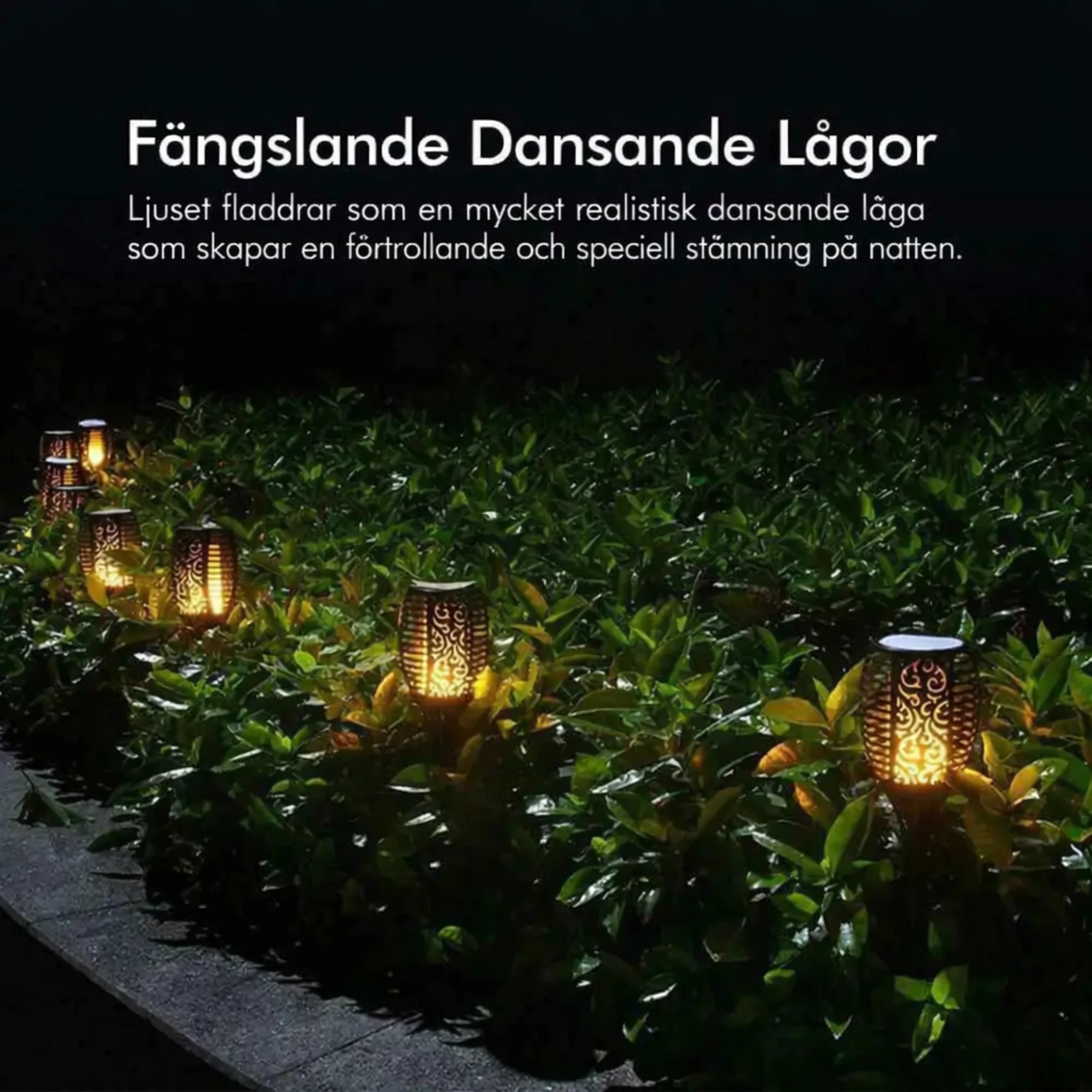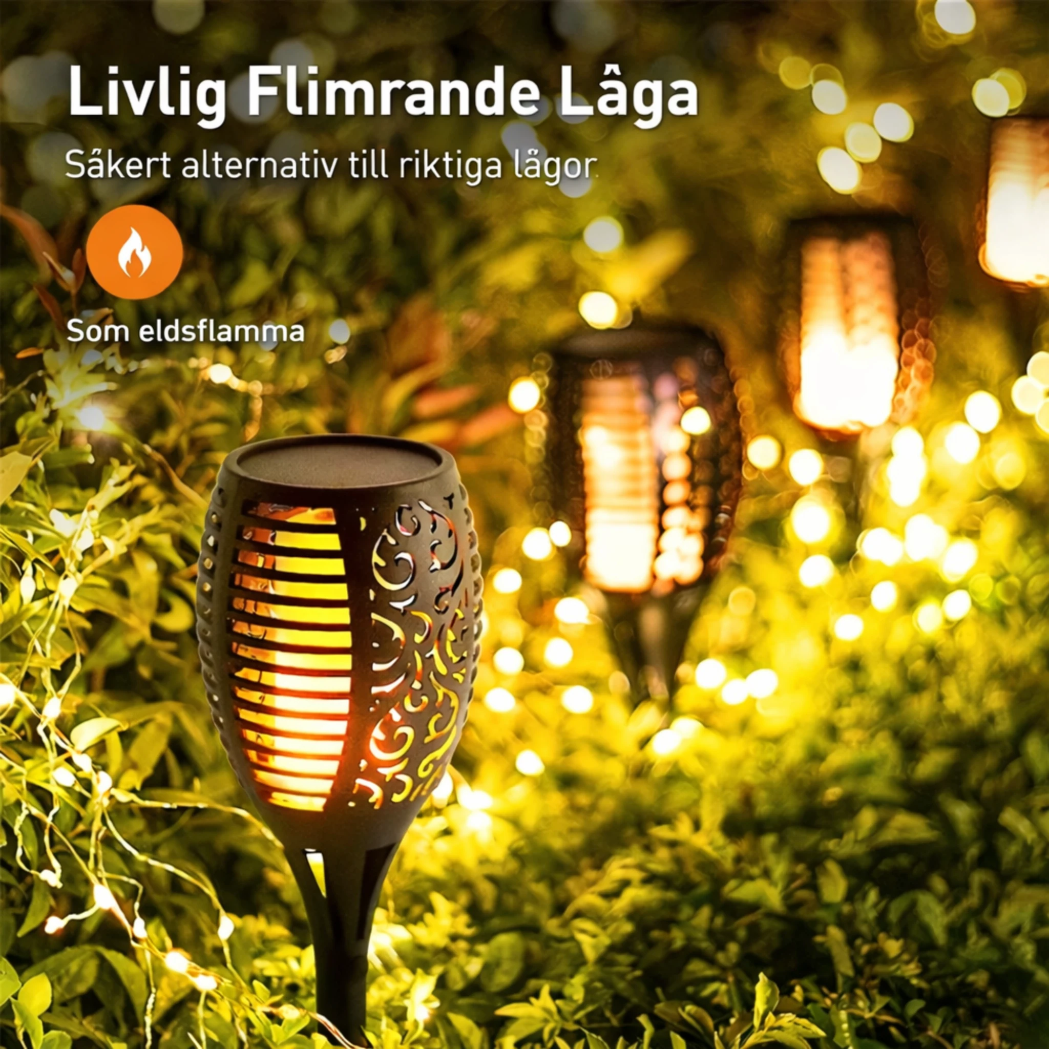 Ge trädgården ett mjukt och inbjudande sken med solcellsfacklor som skapar känslan av levande eld, helt utan öppen låga. Det naturtrogna, fladdrande skenet ger känslan av levande eld - utan rök, sladdar eller krångel.