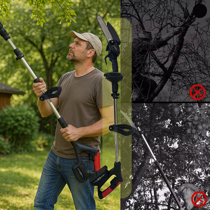 Utrustad med en högpresterande industrikedja och ett kraftfullt 21V litiumbatteri levererar sågen snabba, precisa och rena snitt genom allt från tunna kvistar till tjockare grenar. Med den teleskopiska förlängningsstången når du enkelt höga och svåråtkomliga grenar utan att behöva klättra på stege – vilket ger optimal säkerhet och bekvämlighet vid varje användning.