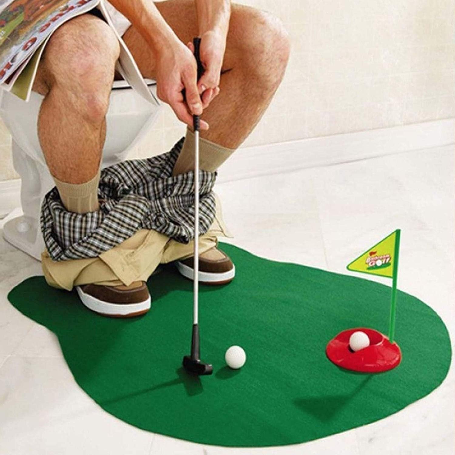 Gör vardagen lite roligare och finslipa din puttning samtidigt! Toalettgolf är det humoristiska träningskitet som låter dig öva precision och teknik – till och med i badrummet. Den mjuka, gröna mattan ger känslan av en riktig green i miniformat, medan den lilla flaggan markerar målet och utmanar ditt fokus.