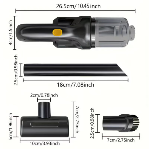 - Paketets innehåll: 1 x minidammsugare, 1 x filter, 1 x USB laddningskabel, 1 x bruksanvisning, 1 x borstmunstycke, 1 x smalt munstycke, 1 x bredare munstycke