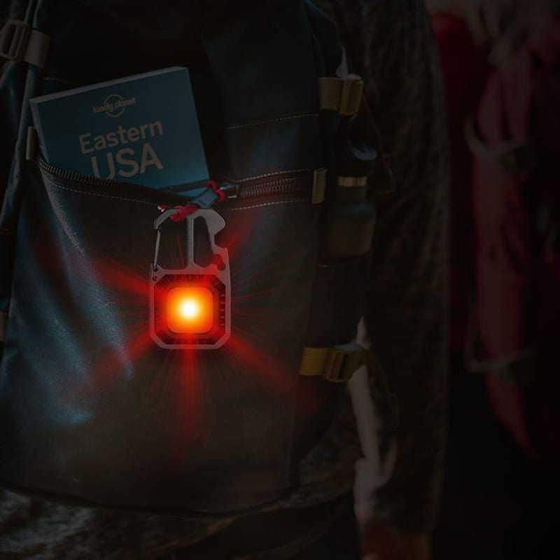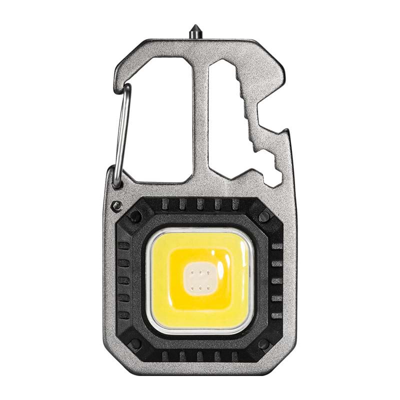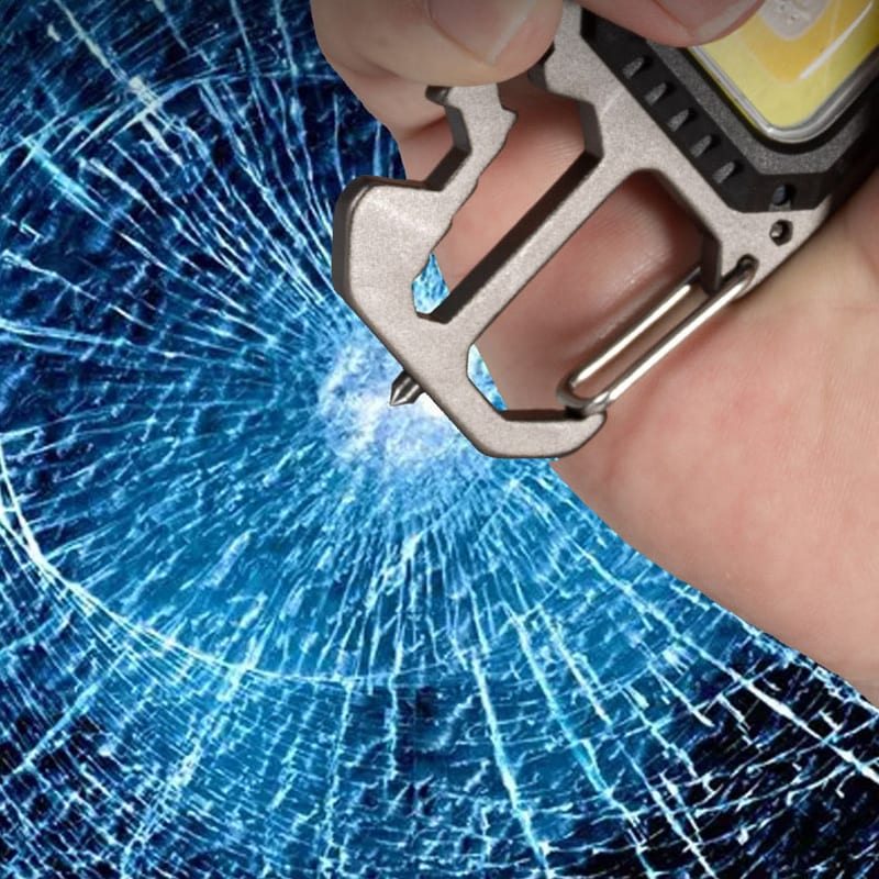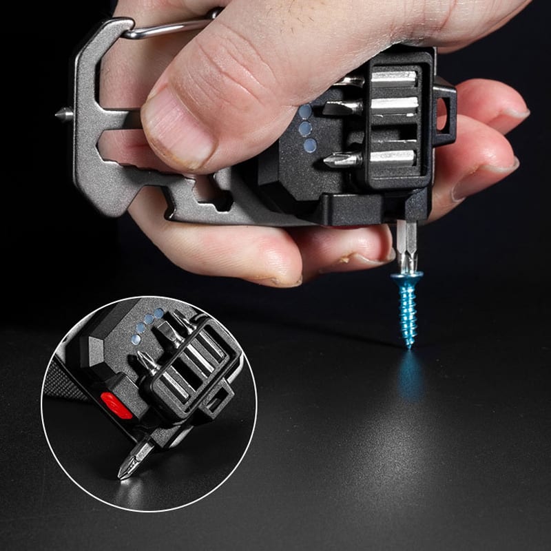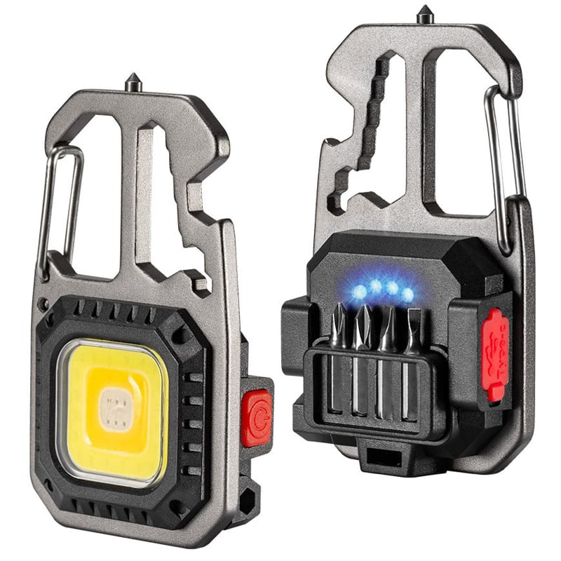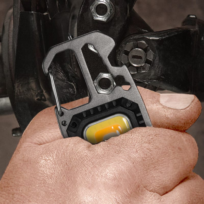 Den har flera smarta funktioner och är lätt att alltid ha med sig. Det sitter fyra bits på lampans baksida som passar i bitshållare. Skruva åt eller släpp på muttrar, krossa fönster i nödsituationer eller öppna en flaska med kapsylöppnaren. Karbinhaken gör den enkel att fästa.